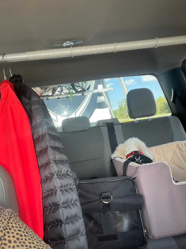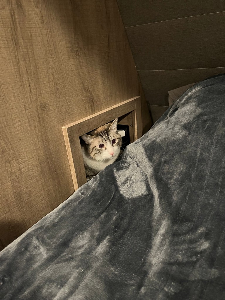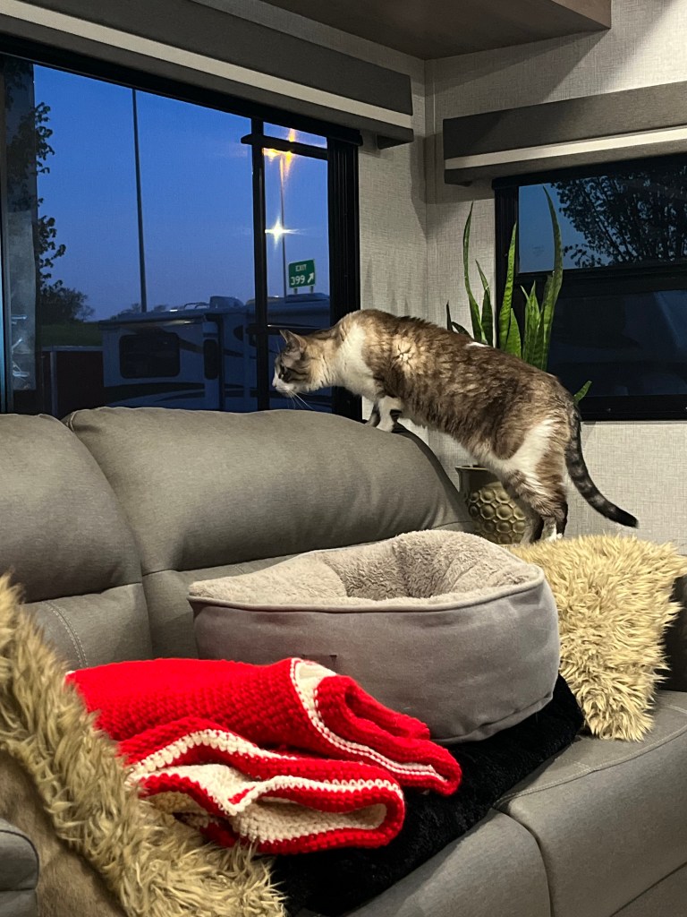 Got up early to pack up and move out. We’re getting pretty good at it lol. I prepare the inside while Joel does the outside. Then I go out and guide as he backs up the truck and we hook up. I feel like a scrub nurse lol. I hand him the pieces and tools as he goes through the process. We are starting to look like pros! Then I load up the animals and we close the slides. Theo now knows the sounds of hooking up to leave and usually hides under the recliners. I opened them up and he wasn’t there. Humm! Not too many other places to hide in a trailer. Guess where I found him? Lol not sure how he fit in the small cubby by the bed!