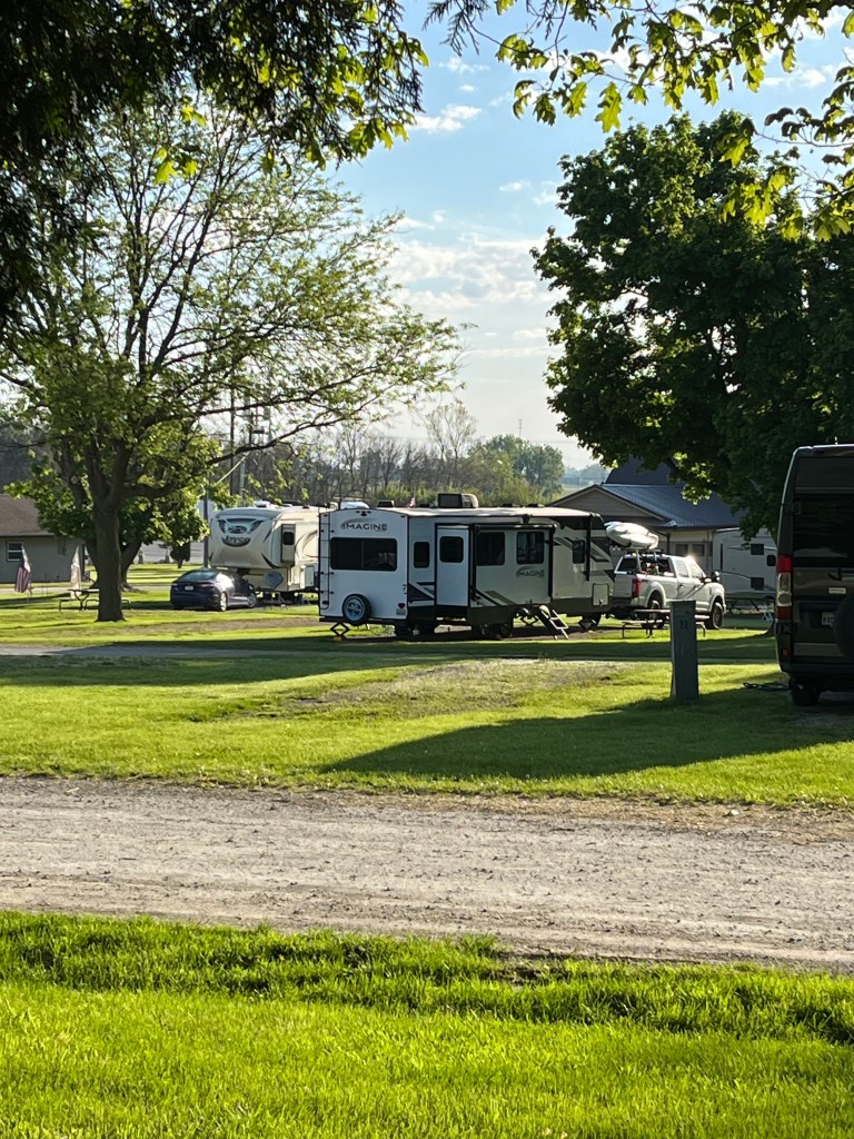 We hit the road about 8:30 on day three and had a 300 mile drive to Wolfe’s Leisure Time Campground in West Lafayette. Lots of construction and white knuckle driving in revised lanes on highway 80 and lots of traffic around the Chicago area. But….drumroll🥁! We made it!!! Against all the odds, issues, weather, you name it, we made it as planned!